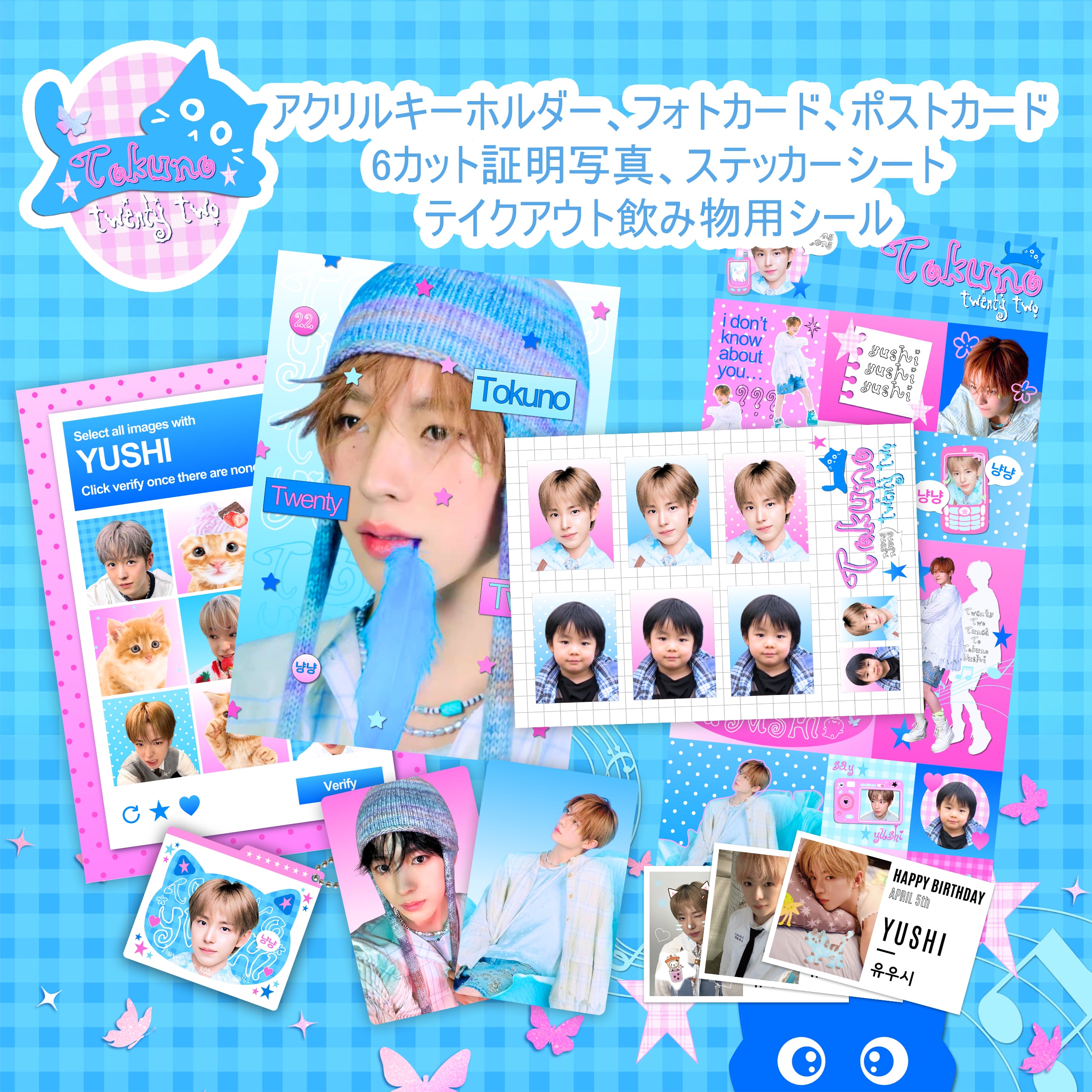 (アクリルキーホルダー、フォトカード、ポストカード、6カット証明写真、ステッカーシート、テイクアウト飲み物用シール)